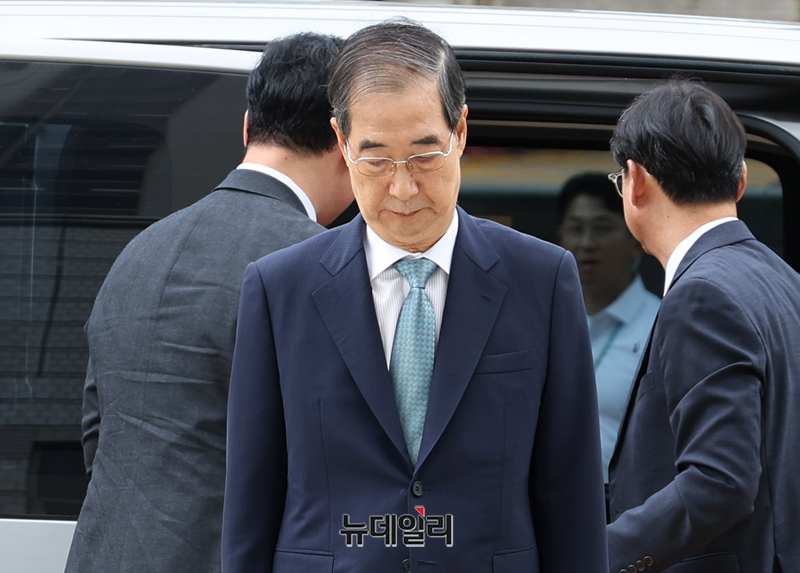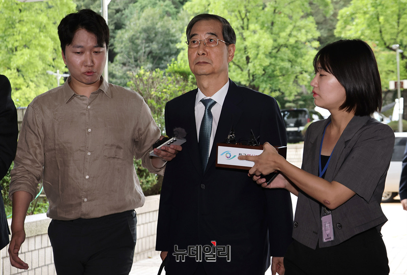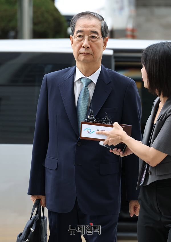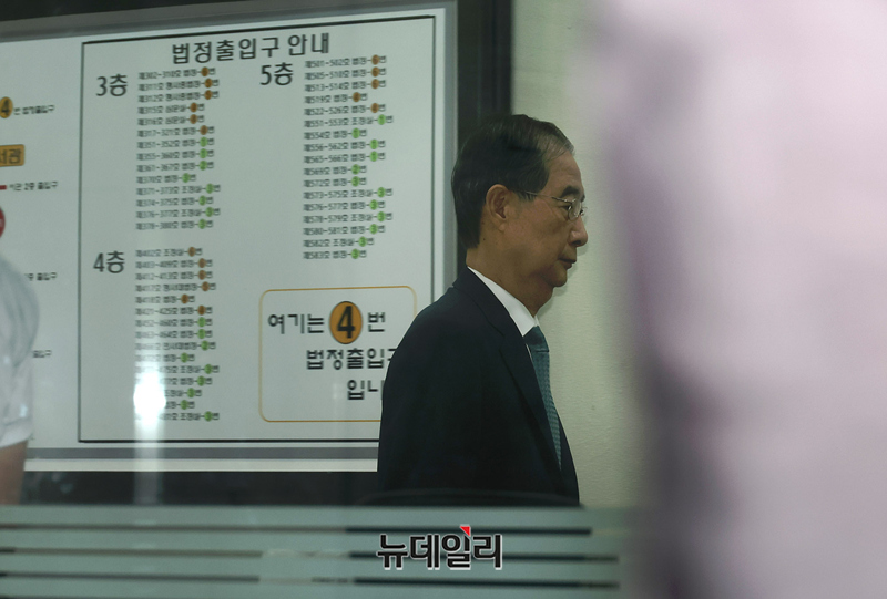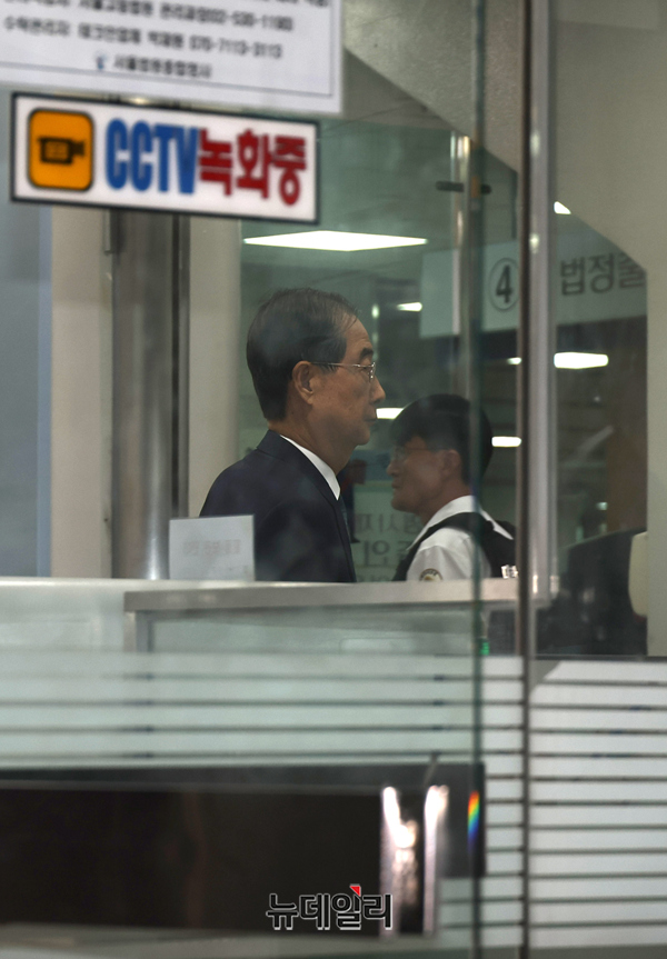 내란우두머리 방조 혐의를 받고 있는 한덕수 전 국무총리가 27일 오후 서울 서초구 서울중앙지법에서 열린 영장심사에 출석하고 있다. 전직 국무총리의 영장심사는 헌정 사상 처음이다.