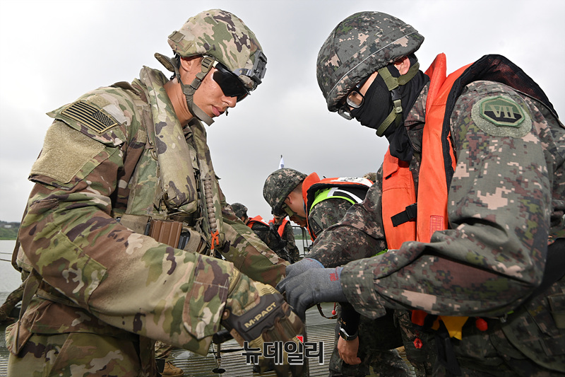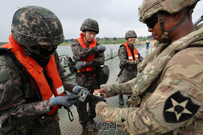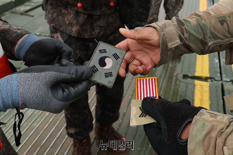 육군 제7공병여단과 미2사단/한미연합사단 장병들이 27일 오전 경기 여주시 남한강 일대에서 열린 한미연합 제병협동 도하훈련에서 교절 연결을 마치고 국기 패치를 교환하고 있다. (경기 여주=서성진 기자)