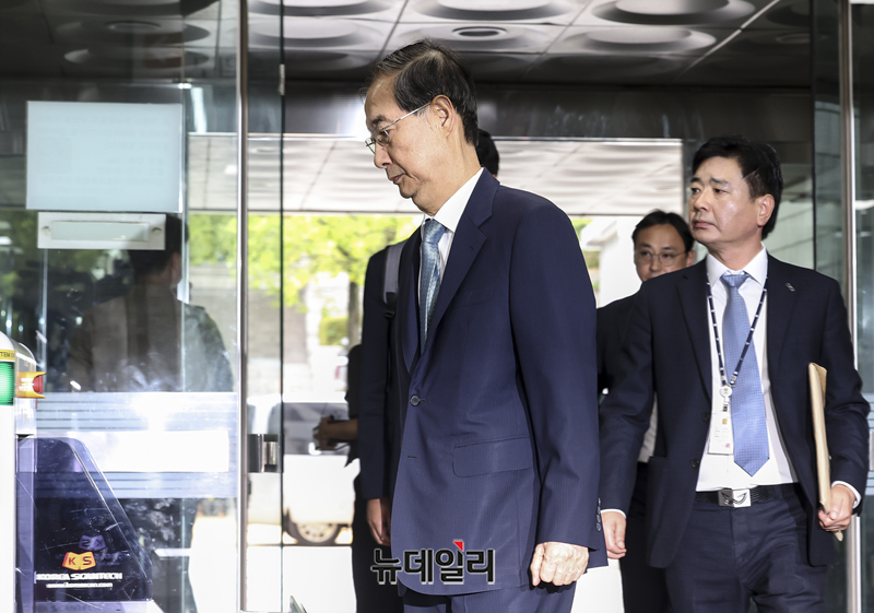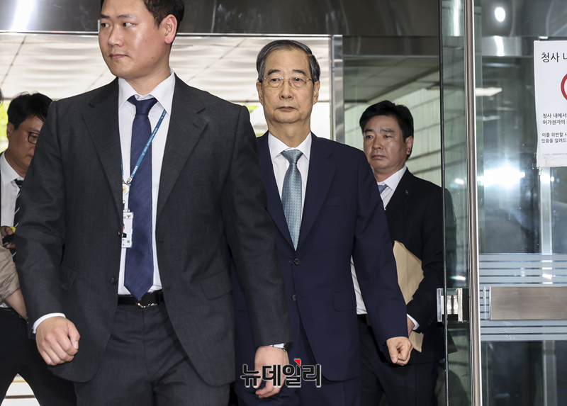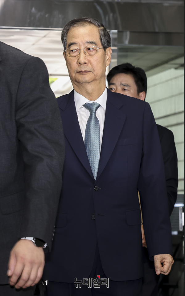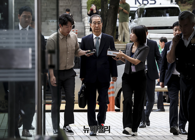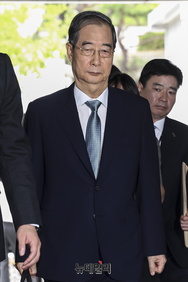 내란우두머리 방조 혐의를 받고 있는 한덕수 전 국무총리가 27일 오후 서울 서초구 서울중앙지법에서 열린 영장심사에 출석하고 있다. 전직 국무총리의 영장심사는 헌정 사상 처음이다.