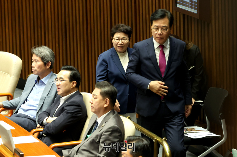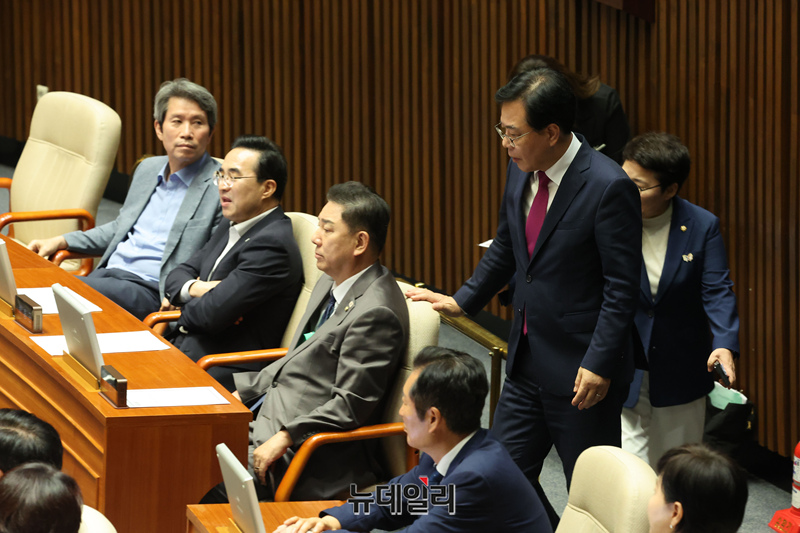 송언석 국민의힘 원내대표가 27일 오후 국회 본청에서 열린 국회 본회의에서 국민의힘 추천 국가인권위원 후보자들의 선출안이 부결되자 김병기 더불어민주당 원내대표에게 향하고 있다.