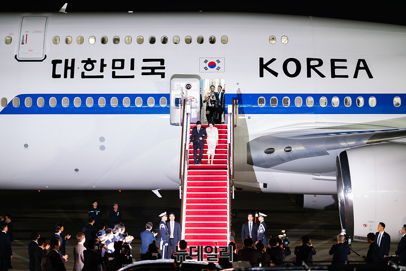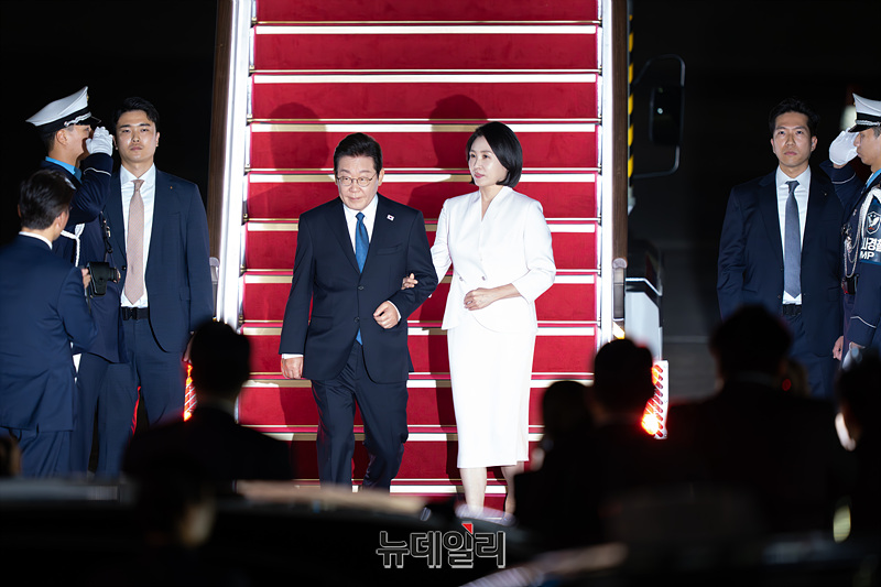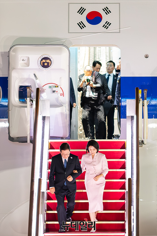 3박 6일간의 일본·미국 순방 일정을 마친 이재명 대통령이 28일 경기 성남시 서울공항을 통해 부인 김혜경 여사와 함께 귀국하고 있다. (경기 성남=서성진 기자)