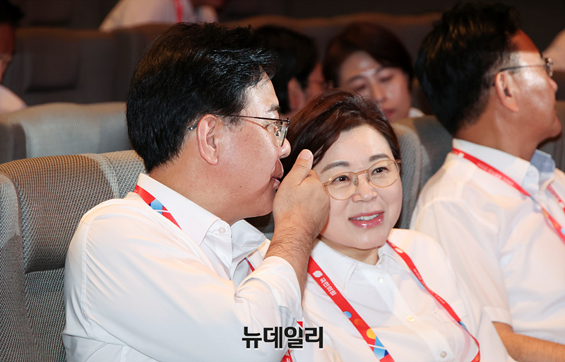 송언석 국민의힘 원내대표와 김정재 정책위의장이 28일 오후 인천 영종도 인천국제공항공사 인재개발원에서 열린 국민의힘 연찬회에서 대화를 나누고 있다. (인천=서성진 기자)