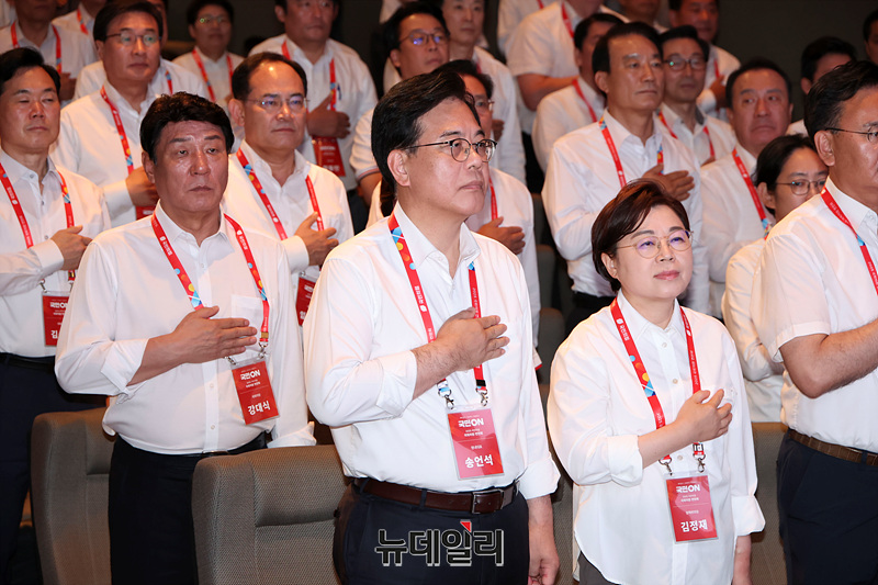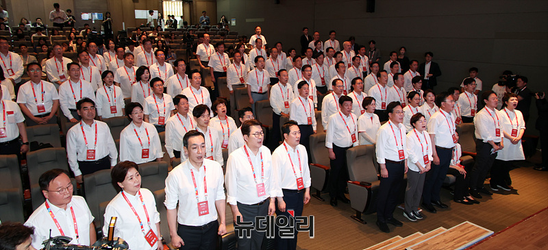 장동혁 국민의힘 대표와 송언석 원내대표를 비롯한 의원들이 28일 오후 인천 영종도 인천국제공항공사 인재개발원에서 열린 국민의힘 연찬회에서 국민의례를 하고 있다. (인천=서성진 기자)