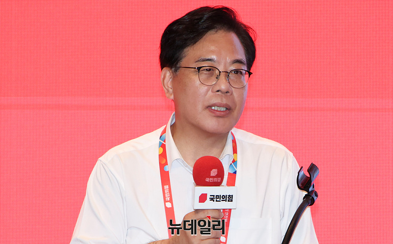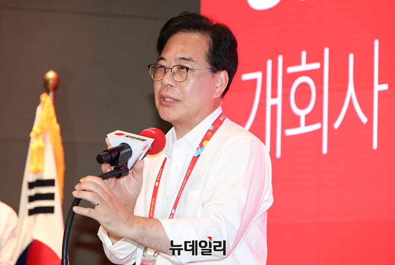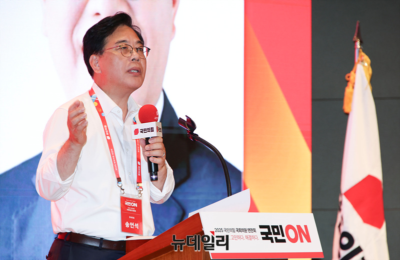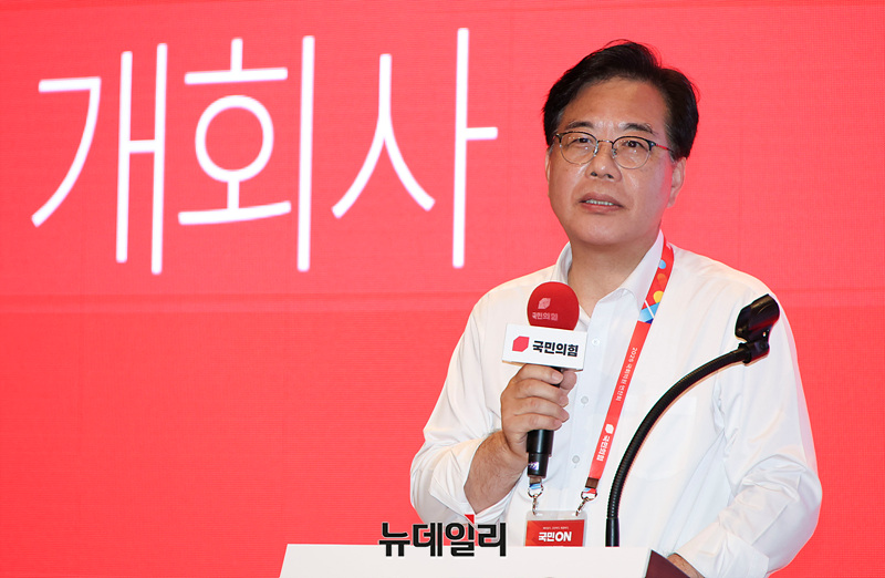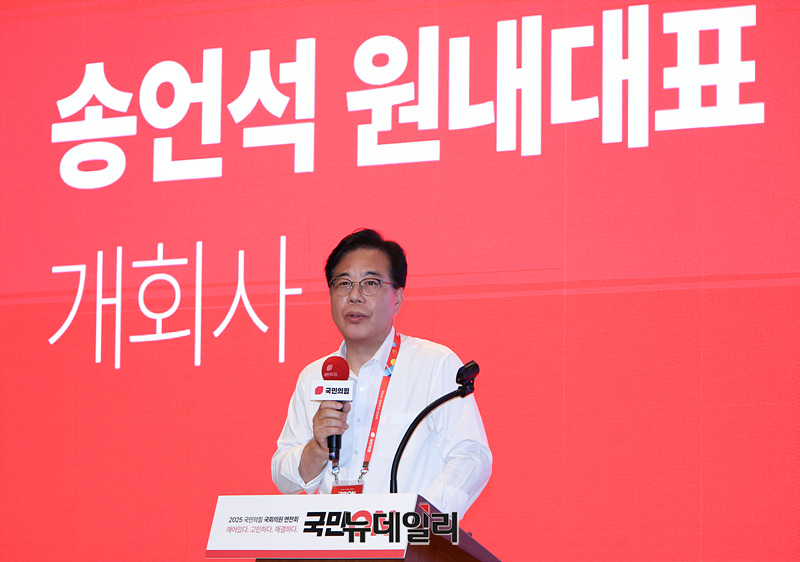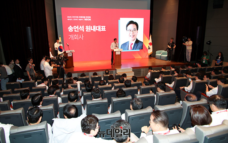 송언석 국민의힘 원내대표가 28일 오후 인천 영종도 인천국제공항공사 인재개발원에서 열린 국민의힘 연찬회에서 개회사를 하고 있다. (인천=서성진 기자)