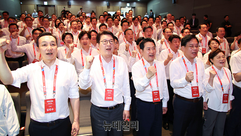 장동혁 국민의힘 대표, 송언석 원내대표를 비롯한 의원들이 28일 오후 인천 영종도 인천국제공항공사 인재개발원에서 열린 국민의힘 연찬회에서 구호를 외치고 있다. (인천=서성진 기자)