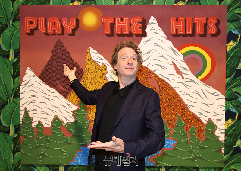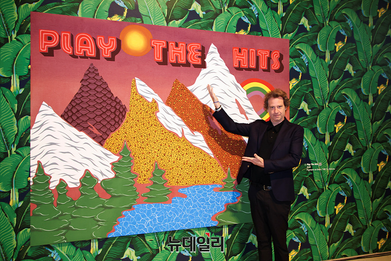 미국 팝아트 작가 조엘 메슬러가 1일 오전 인천 중구 파라다이스시티 아트스페이스에서 열린 국내 첫 개인전 파라다이스 파운드(Paradise Found) 사전공개 행사에서 작품 앞에서 포즈를 취하고 있다.