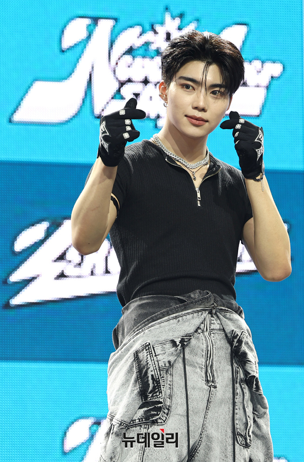 제로베이스원 박건욱이 1일 오후 서울 용산구 블루스퀘어에서 열린 첫 정규 앨범 'NEVER SAY NEVER(네버 세이 네버)' 쇼케이스에서 포즈를 취하고 있다.