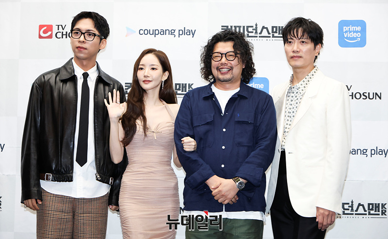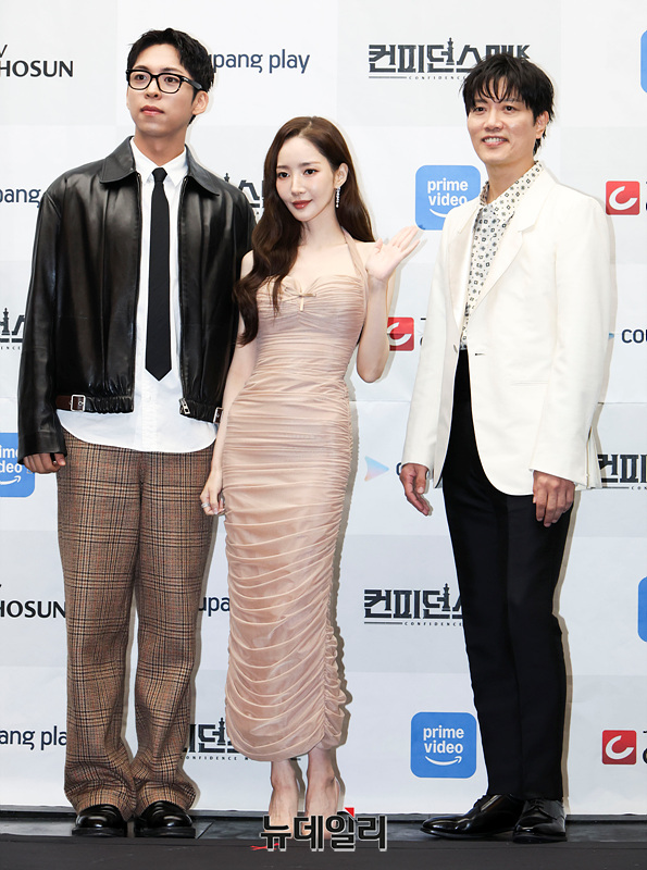 배우 박희순, 박민영, 주종혁이 1일 오후 서울 마포구 상암 스탠포드호텔에서 열린 TV CHOSUN 주말미니시리즈 '컨피던스맨 KR' 제작발표회에서 포즈를 취하고 있다.