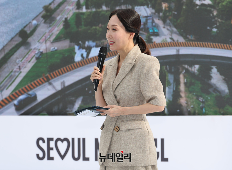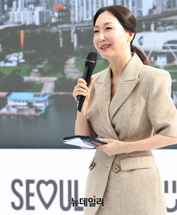 오유경 전 KBS 아나운서가 1일 오후 서울 광진구 뚝섬한강공원 서측구역에서 열린 제2회 서울조각페스티벌 개막식에서 인사말을 하고 있다.