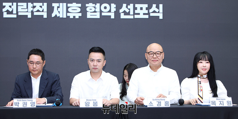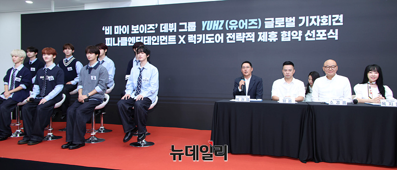 박권영 피나클엔터테인먼트 CEO를 비롯한 참석자들과 이 1일 오후 서울 용산구 썸머스타에서 열린 피나클엔터테인먼트X럭키도어 전략적 제휴 협약 선포식에 참석해 자리하고 있다.