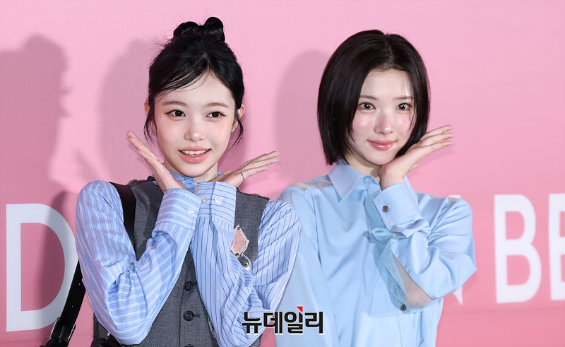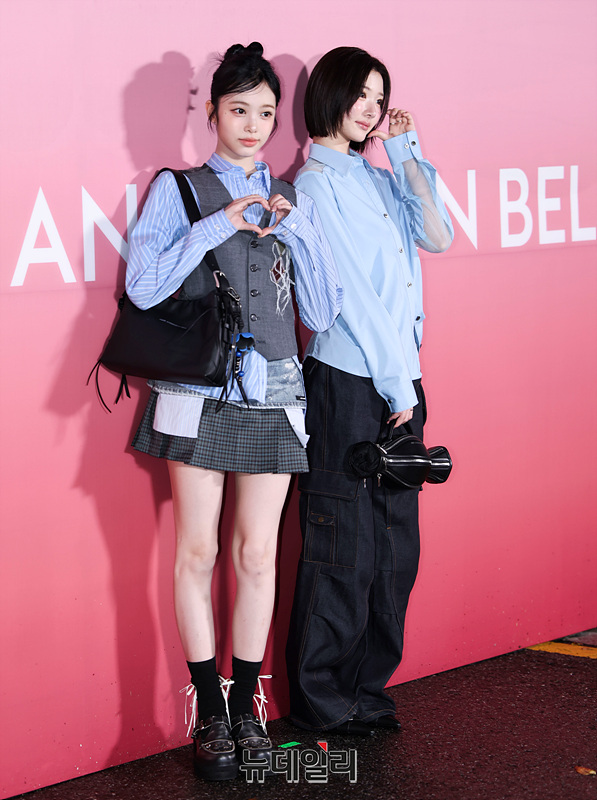 하츠투하츠 이안과 지우가 1일 오후 서울 중구 정동 덕수궁길에서 열린 2026 S/S 서울패션위크 오프닝쇼 앤더슨벨 포토월에서 포즈를 취하고 있다.