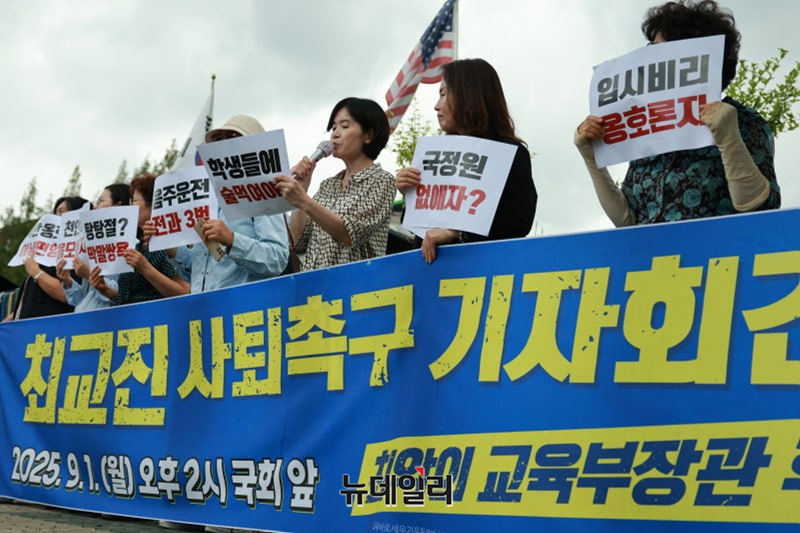 교육바로세우기운동본부를 비롯한 전국학부모단체연합이 1일 오후 국회의사당 앞에서 최교진 교육부 장관 후보의 사퇴를 촉구하는 기자회견을 갖고 있다.