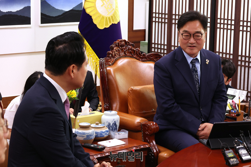 장동혁 국민의힘 대표가 2일 오전 국회에서 우원식 국회의장을 예방해 환담을 나누고 있다.