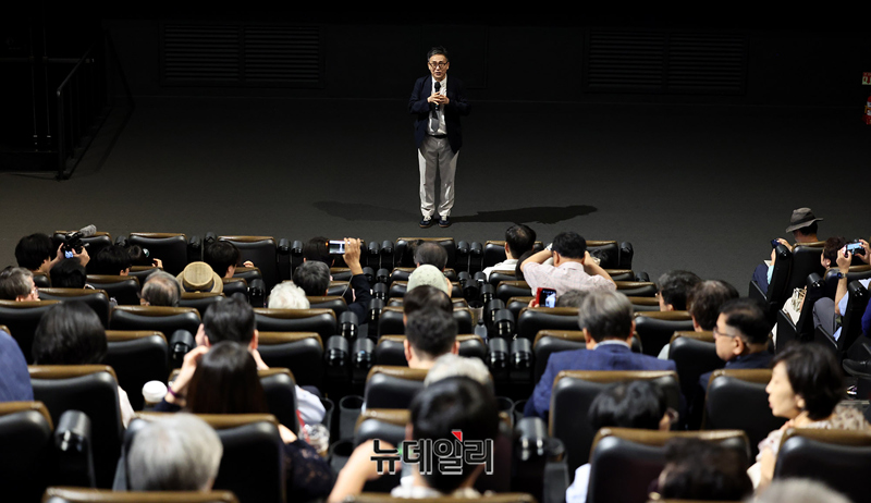 다큐멘터리 영화 건국전쟁2를 연출한 김덕영 감독이 2일 오전 서울 CGV용산아이파크몰에서 열린 건국전쟁2 시사회에서 작품소개를 하고 있다.