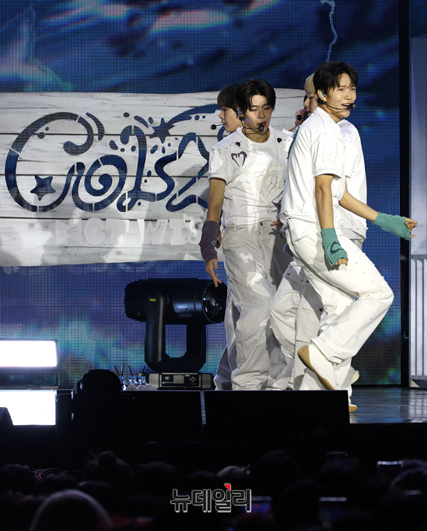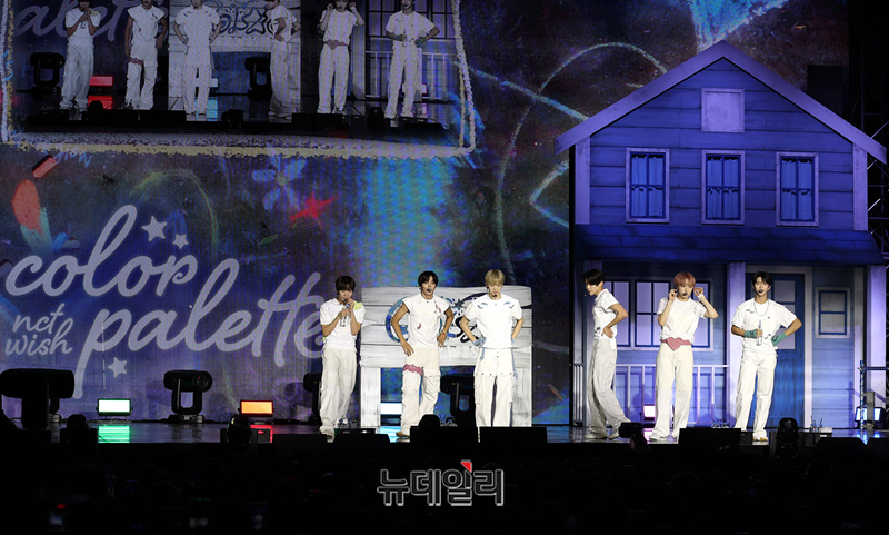 NCT WISH가 2일 오후 서울 강남구 코엑스 광장에서 열린 미니3집 COLOR 발매기념 쇼케이스에서 타이틀곡 무대를 선보이고 있다.
