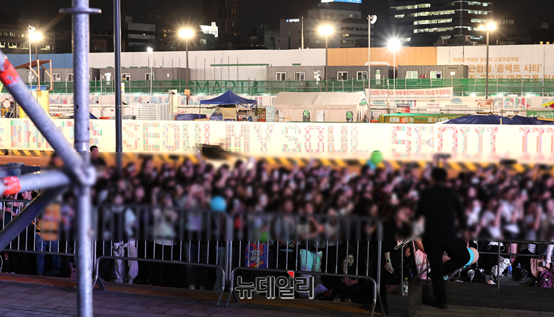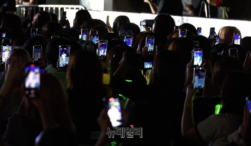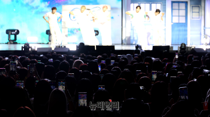 NCT WISH가 2일 오후 서울 강남구 코엑스 광장에서 열린 미니3집 COLOR 발매기념 쇼케이스에서 타이틀곡 무대를 선보이는 가운데 팬들이 첫 무대를 휴대폰으로 촬영하고 있다.코엑스 광장 일대에서 열린 WISH ON STAGE는 이번 앨범 발매를 기념해 마련된 오프라인 이벤트로 신곡 무대를 최초로 공개했다.이번 앨범COLOR는 동명의 타이틀곡 컬러를 포함해 총 7곡으로 구성됐다. NCT WISH만의 다채로운 색깔로 세상을 가득 채원 나가겠다는 포부를 담았다.