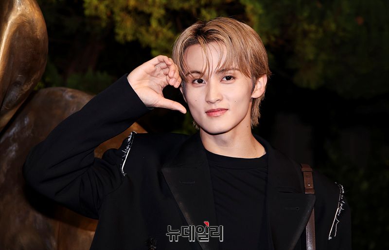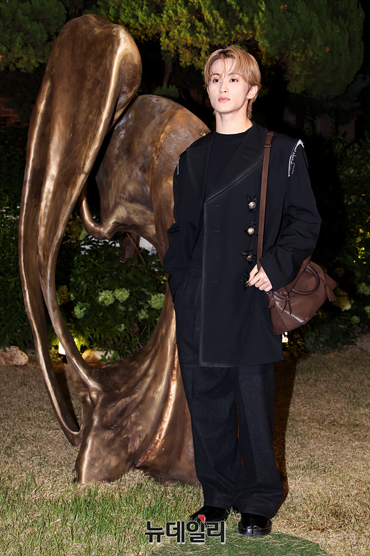 NCT 마크가 2일 오후 서울 용산구 메종 마르지엘라 한남 플래그십 부티크에서 열린 메종 마르지엘라. Line 2 첫 챕터 전시 공개 기념 포토월에서 포즈를 취하고 있다.