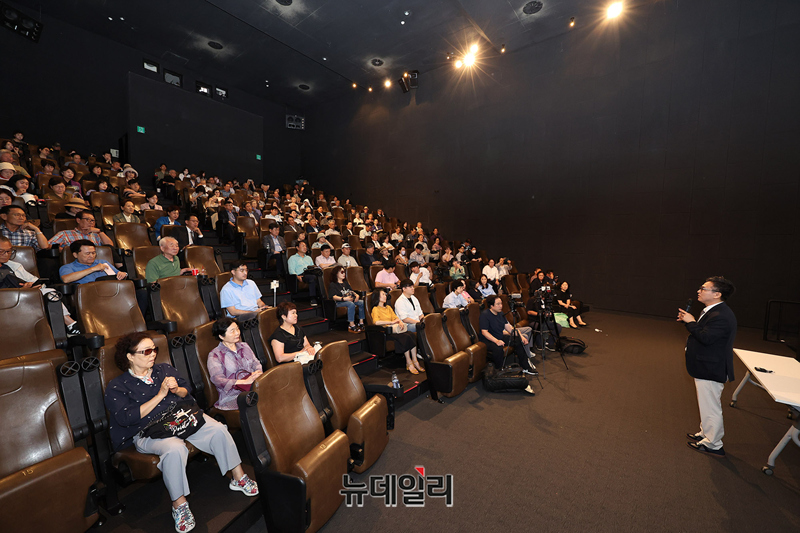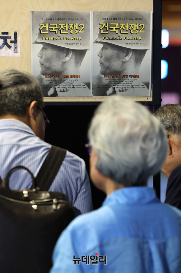 다큐멘터리 영화 건국전쟁2(감독 김덕영) 시사회를 찾은 시민들이 2일 오전 서울 CGV용산아이파크몰에서 열린 시사회에 참석하고 있다.