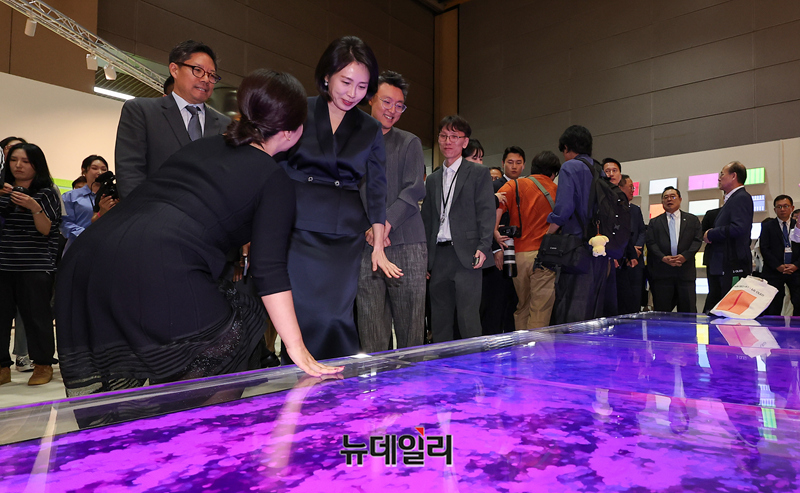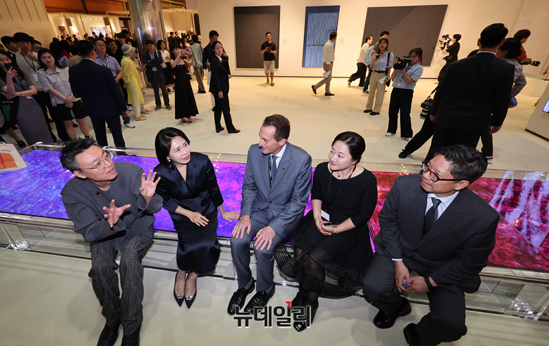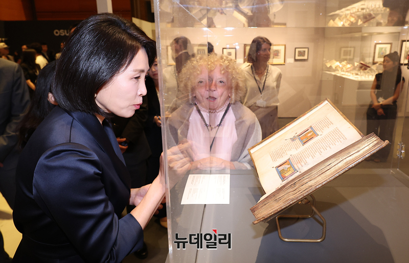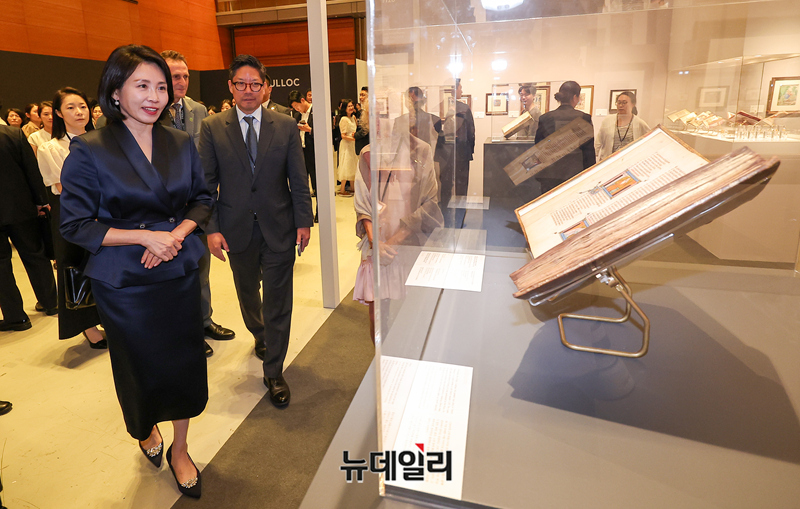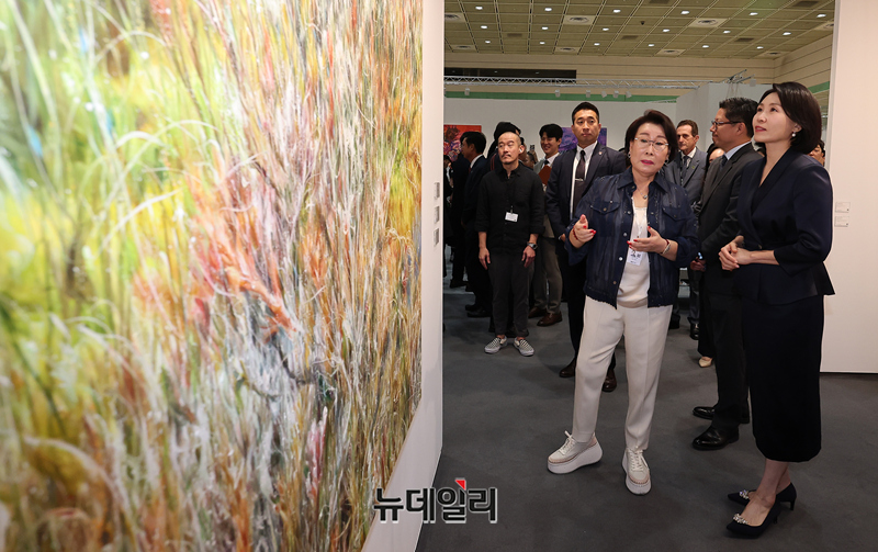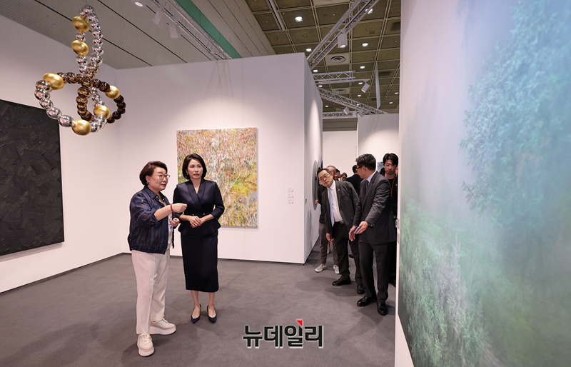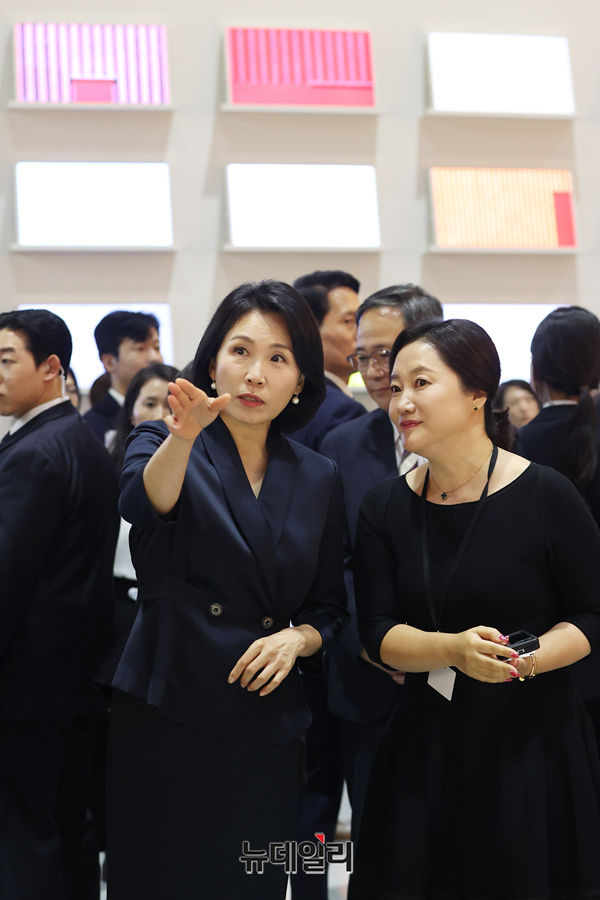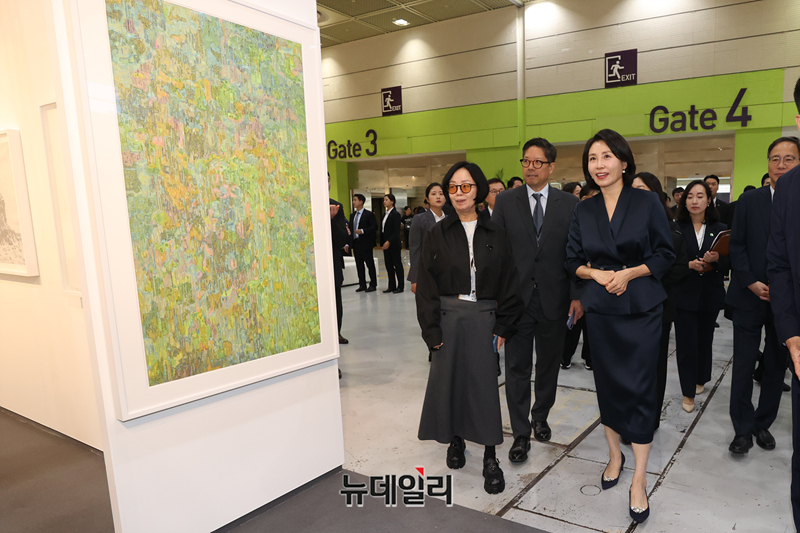 이재명 대통령의 부인 김혜경 여사가 3일 서울 강남구 코엑스에서 열린 '프리즈 서울 2025' VIP 프리뷰 데이에서 작품 감상을 하고 있다.