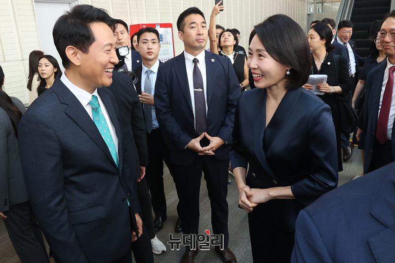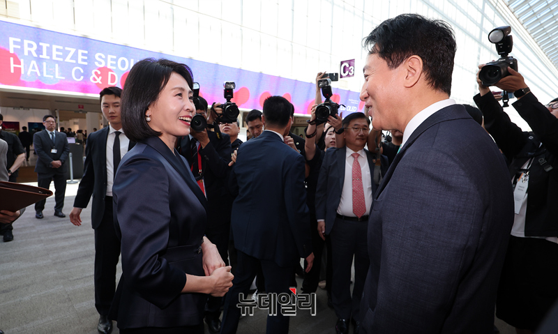 이재명 대통령의 부인 김혜경 여사와 오세훈 서울시장이 3일 서울 강남구 코엑스에서 열린 '프리즈 서울 2025' VIP 프리뷰 데이에서 만나 인사를 나누고 있다.