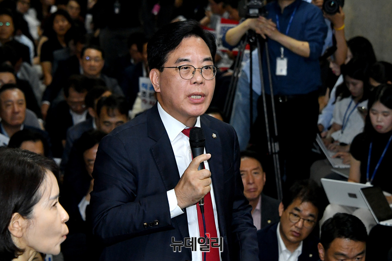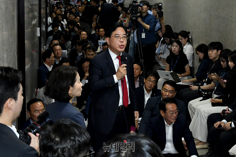 조은석 내란 특별검사팀이 국민의힘 원내대표실에 대한 압수수색을 재시도한 3일 국민의힘 송언석 원내대표가 국회 원내대표실을 찾은 특검팀을 향해 항의발언을 하고 있다.