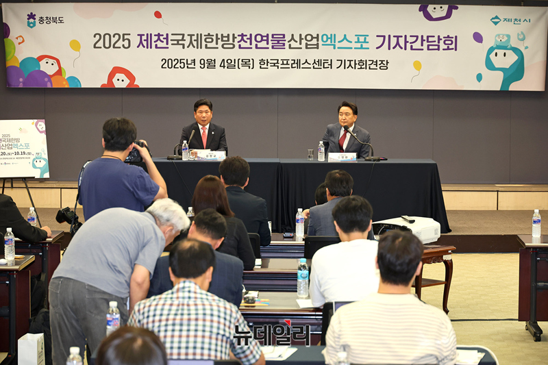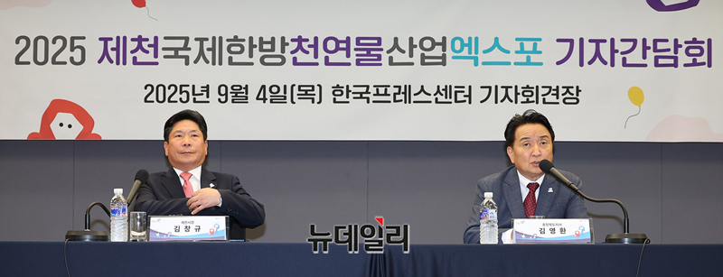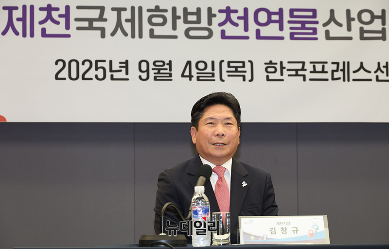 조직위원장을 맡은 김창규 제천시장이 4일 오전 서울 중구 한국프레스센터에서 열린 '2025 제천국제한방 천연물 산업엑스포' 기자간담회에서 인사말을 하고 있다.이번 행사는 '천연물과 함께하는 세계, 더 나은 미래를 만나다'를 주제로 9월 20일부터 10월 19일까지 30일동안 한방엑스포공원 일원에서 개최된다.B2B 중심의 산업엑스포로 산업, 학술, 문화가 어우러진 글로벌 교류의 장이자, 천연물 산업의 신성장 동력을 제시하는 무대가 될것으로 기대하고 있다.