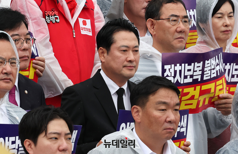 장동혁 국민의힘 대표가 4일 오전 국회 본청 계단에서 열린 야당말살 정치탄압 특검수사 규탄대회에서 규탄구호를 외치고 있다.