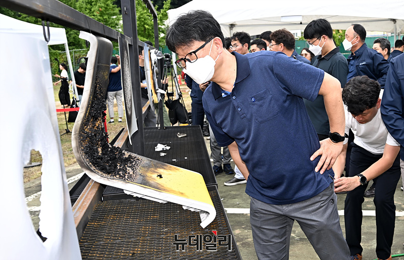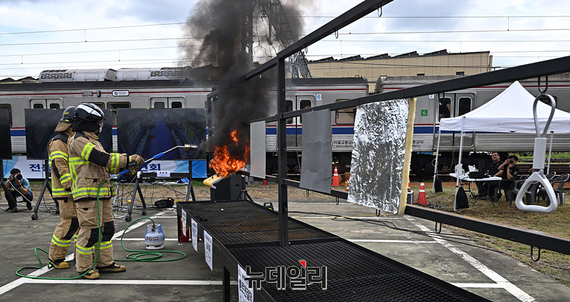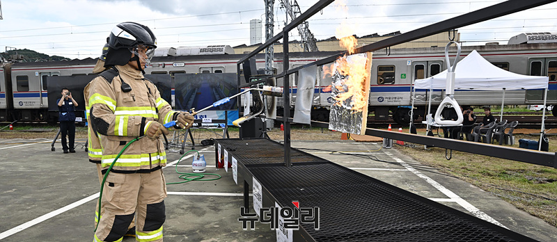 5호선 열차 방화관련 화재안정성 및 비상대응 검증을 위한 전동차 화재안전 시연회가 열린 4일 오후 경기 고양시 지축차량기지에서 소방 관계자가 전동차 내장재 6종에 대한 방염 성능 테스트를 하고 있다. (경기 고양=서성진 기자)