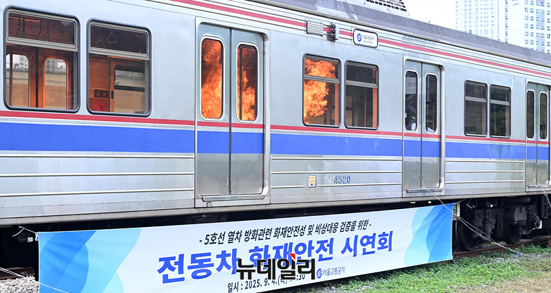 5호선 열차 방화관련 화재안정성 및 비상대응 검증을 위한 전동차 화재안전 시연회가 열린 4일 오후 경기 고양시 지축차량기지에서 전동차 내부에 화재로 인한 연기로 가득 차 있다. (경기 고양=서성진 기자)