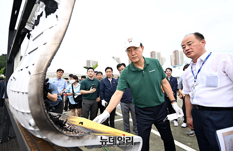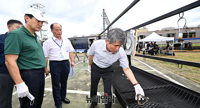 5호선 열차 방화관련 화재안정성 및 비상대응 검증을 위한 전동차 화재안전 시연회가 열린 4일 오후 경기 고양시 지축차량기지에서 오세훈 서울시장이 방염 성능 결과를 확인하고 있다. (경기 고양=서성진 기자)