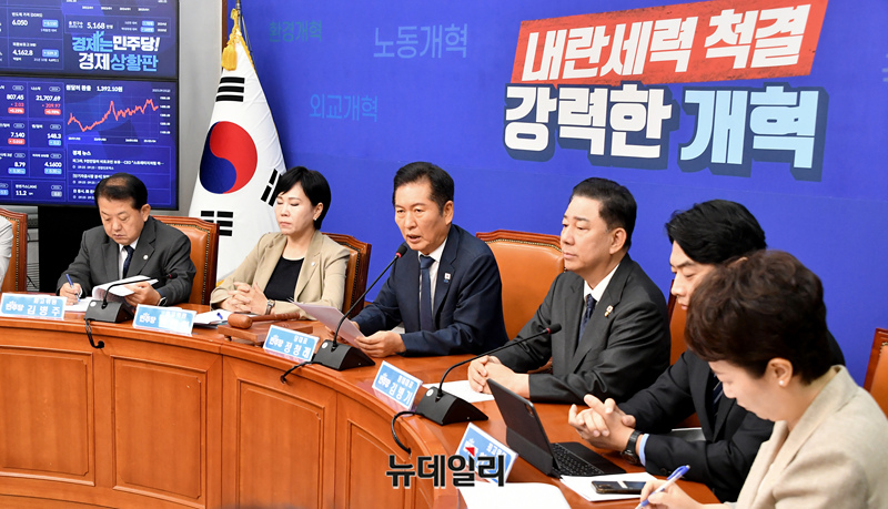정청래 더불어민주당 대표가 5일 국회에서 열린 최고위원회의에 참석해 모두발언을 하고 있다.