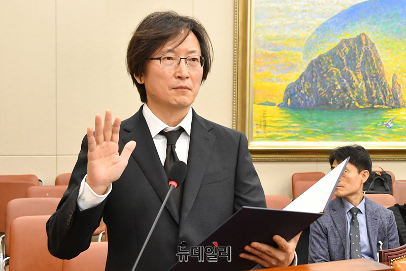 이희동 부산고검 검사 등 증인들이 5일 오전 국회 법제사법위원회 법안심사1소위원회에서 열린 검찰개혁 공청회에서 선서를 하고 있다.