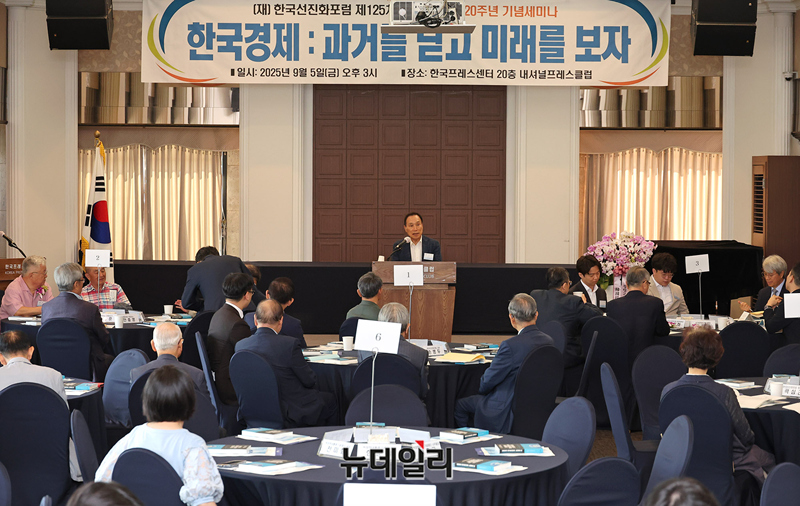 김광두 국가미래연구원장이 5일 오후 서울 중구 한국프레스센터에서 열린 한국선진화포럼 창립 20주년 기념 세미나에서 인사말을 하고 있다.'한국경제 : 과거를 딛고 미래를 보자' 주제로 열린 토론회에는 김광두 국가미래연구원장이 좌장을 맡아 김동호 중앙일보 논설위원, 김용하 순천향대 교수가 발제를 맡았다.이어진 토론에는 김홍균 서강대 교수, 박진 KDI 국제정책대학원 교수, 옥동석 인천대 교수, 권순형 지암선진화아카데미 사무총장, 이경한 지암청년포럼 의장이 나섰다.한국선진화포럼은 대한민국이 직면한 시대적 과제를 진단하고, 해법을 모색하며 지속가능한 발전을 모색하고자 각계 인사들과 함께 2005년 창립됐다.