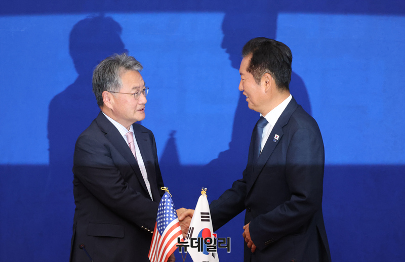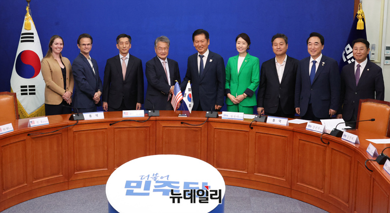 정청래 더불어민주당 대표가 5일 국회에서 조셉 윤 주한미국대사대리를 접견하고 기념 촬영을 하고 있다.