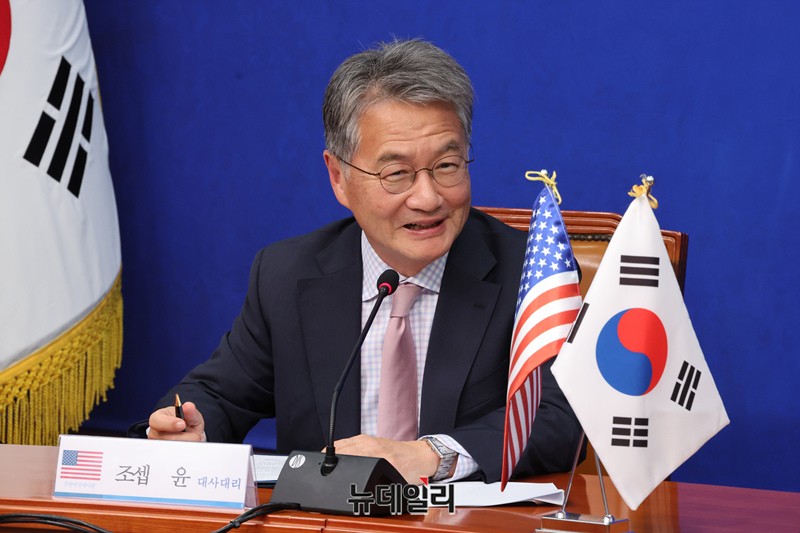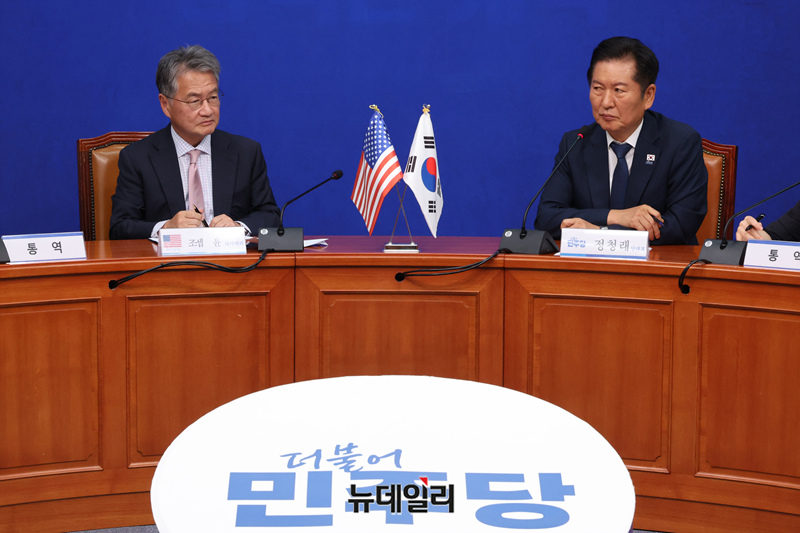 정청래 더불어민주당 대표가 5일 국회에서 조셉 윤 주한 미국대사대리를 접견하고 환담을 나누고 있다.