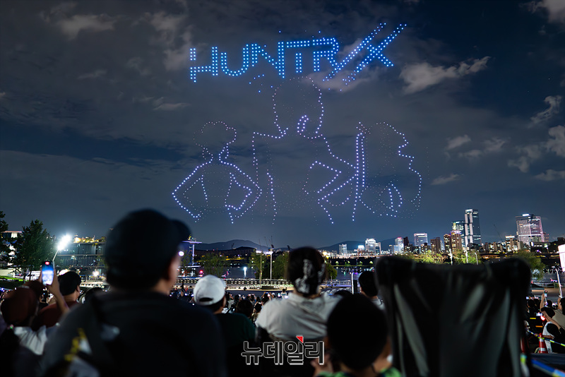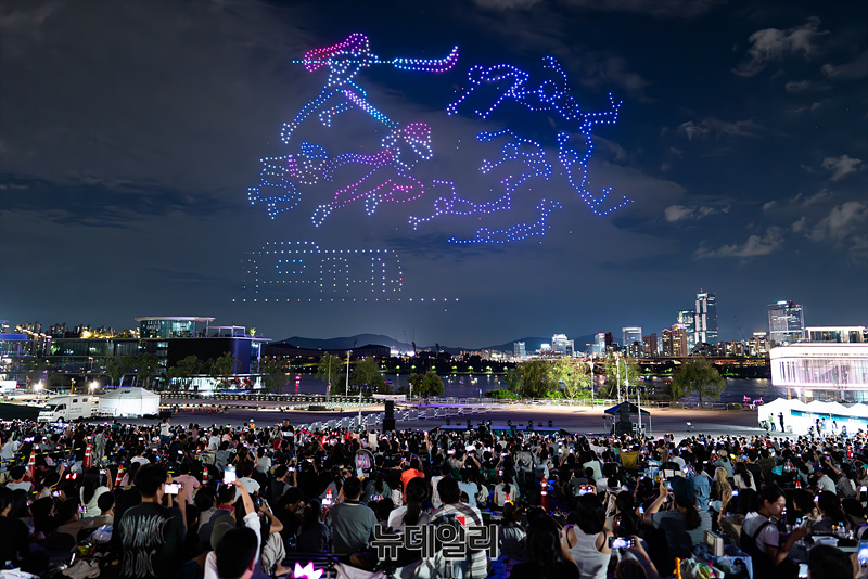'2025 한강 불빛 공연(드론 라이트쇼)'가 열린 7일 오후 서울 광진구 뚝섬한강공원에서 영화 '케이팝데몬헌터스(케데헌)'을 주제로 1,200여 대의 드론이 밤하늘을 수놓고 있다.