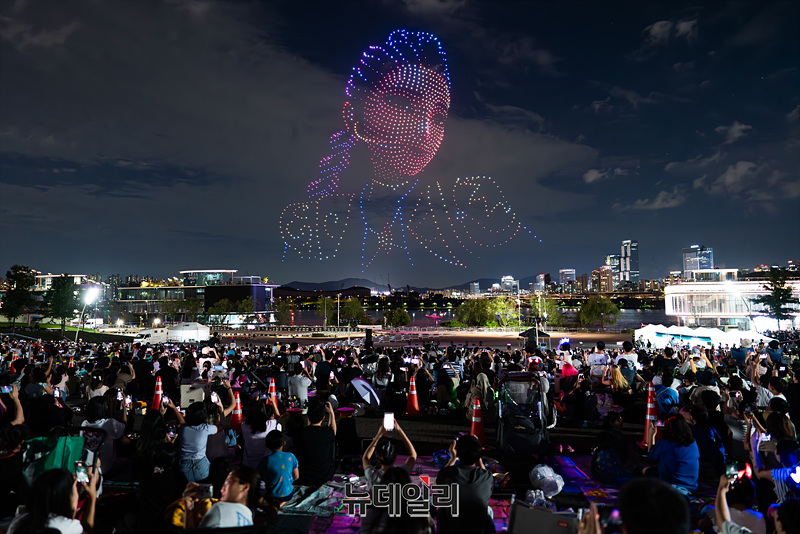 '2025 한강 불빛 공연(드론 라이트쇼)'가 열린 7일 오후 서울 광진구 뚝섬한강공원에서 영화 '케이팝데몬헌터스(케데헌)'을 주제로 1,200여 대의 드론이 밤하늘을 수놓고 있다.