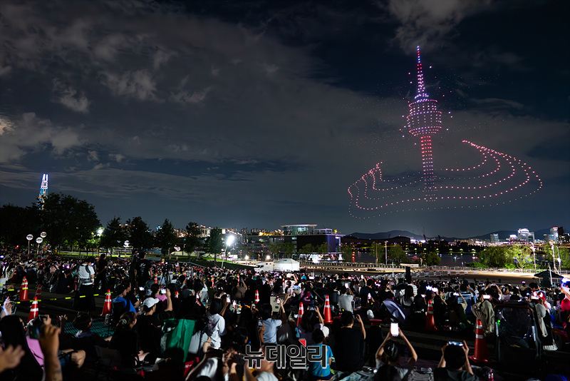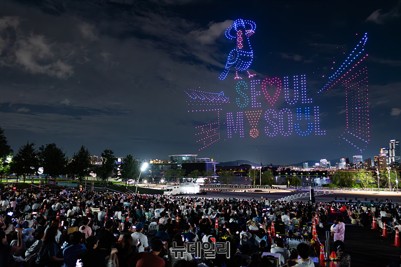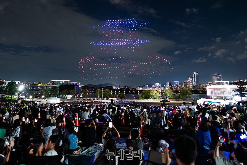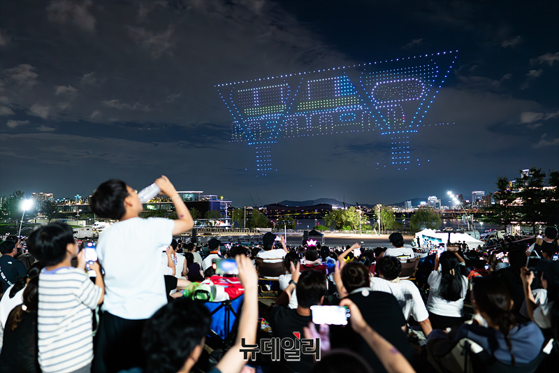 '2025 한강 불빛 공연(드론 라이트쇼)'가 열린 7일 오후 서울 광진구 뚝섬한강공원에서 영화 '케이팝데몬헌터스(케데헌)'을 주제로 1,200여 대의 드론이 밤하늘을 수놓고 있다.