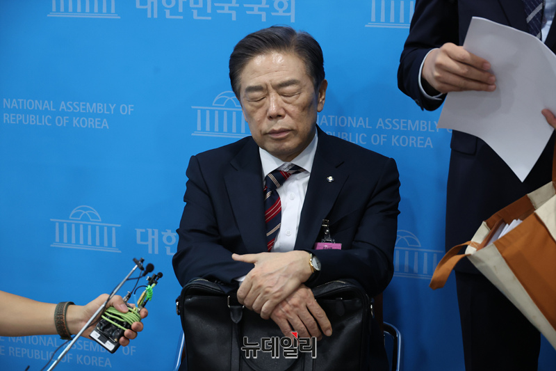 김형석 독립기념관장이 8일 오전 국회에서 기자회견을 하기에 앞서 눈을 감고 순서를 기다리고 있다.