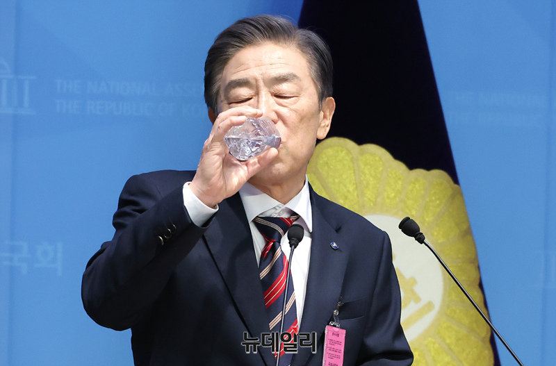 김형석 독립기념관장이 8일 오전 국회 소통관에서 대국민 호소문 발표 중 물을 마시고 있다.