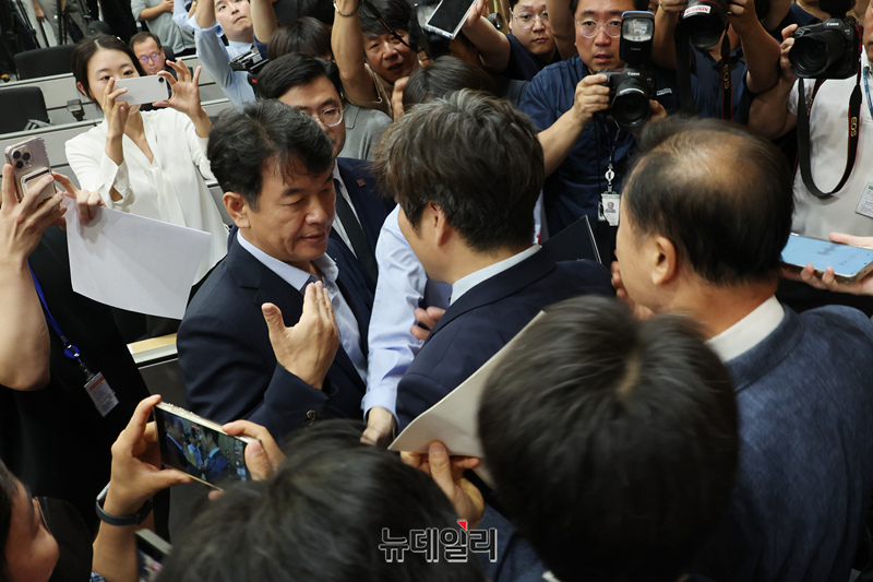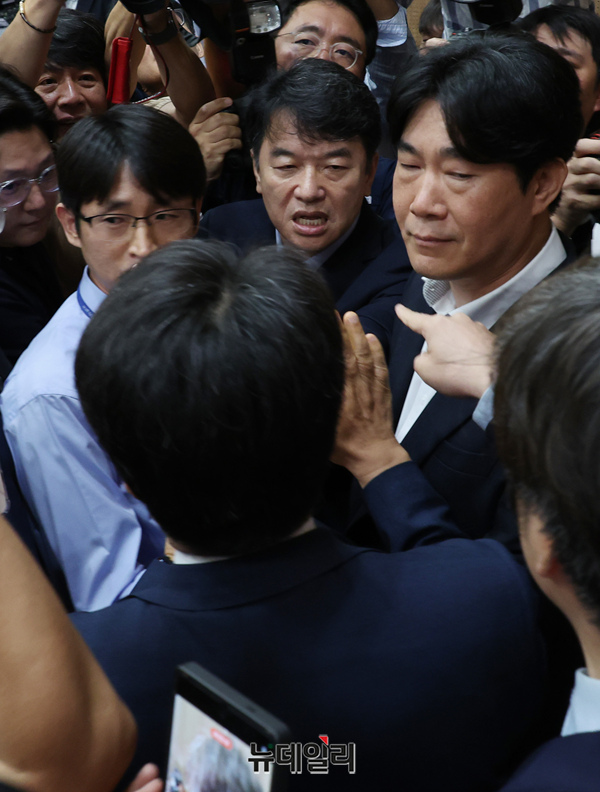 김형석 독립기념관장이 8일 오전 국회 소통관에서 대국민 호소문 발표를 마치고 나서며 문진석 더불어민주당 의원으로부터 항의를 받고 있다.