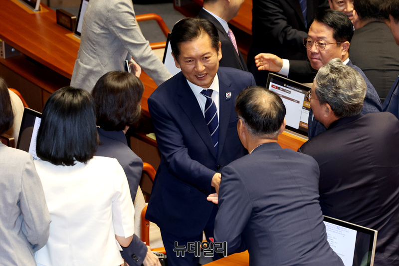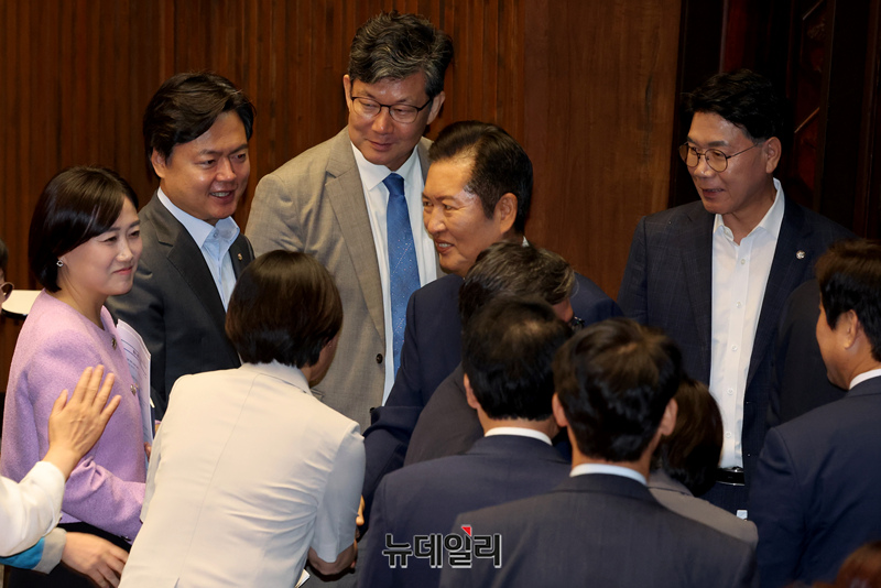 정청래 더불어민주당 대표가 9일 오전 국회에서 열린 본회의에서 교섭단체 대표연설을 마치고 의원들과 악수를 나누고 있다.