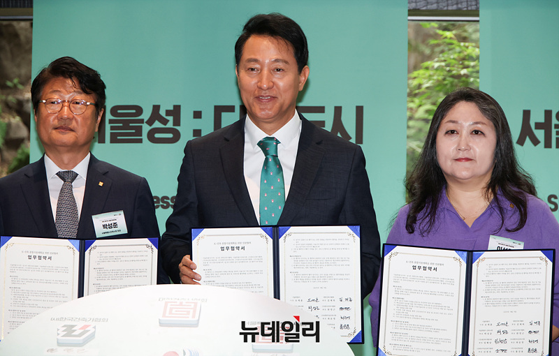 오세훈 서울시장이 9일 오후 서울 종로구 푸투라서울에서 열린 2025 제17회 서울건축문화제 개막행사에서 'K-건축 종합지원계획을 위한 민관협력 업무협약'을 하고 있다.