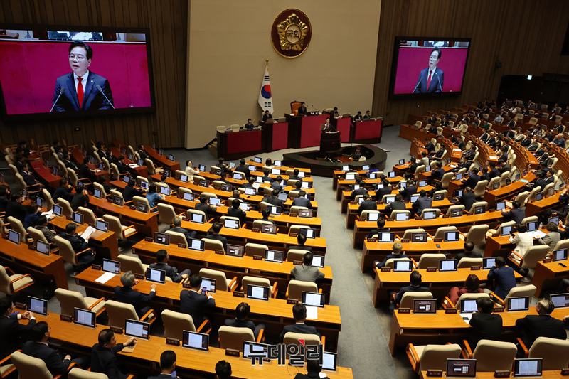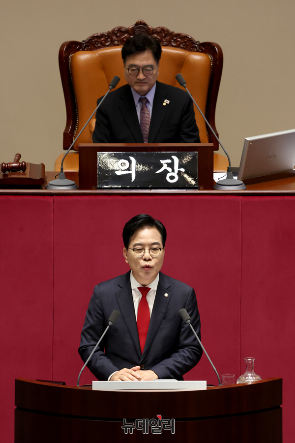 송언석 국민의힘 원내대표가 10일 오전 국회에서 열린 본회의에서 교섭단체 대표연설을 하고 있다.