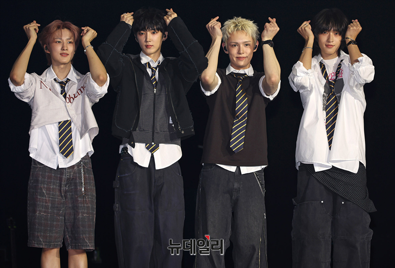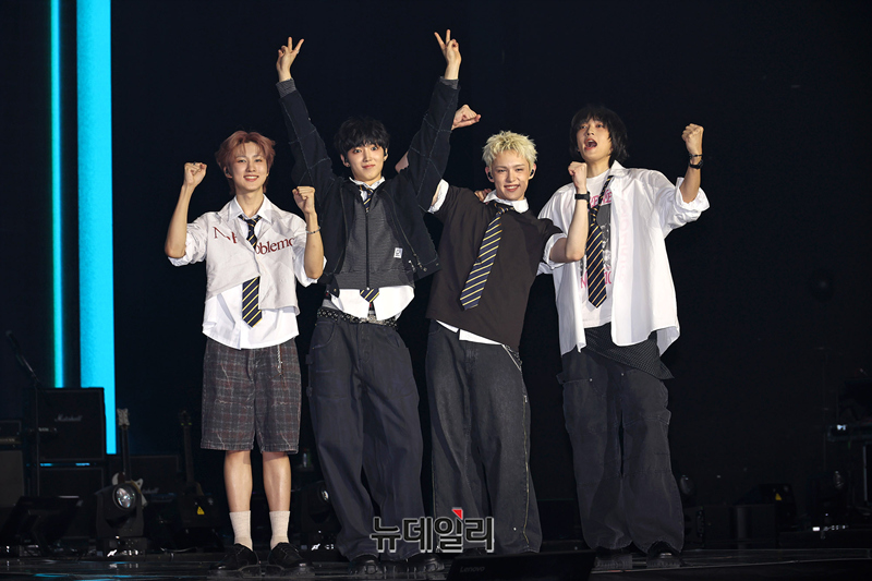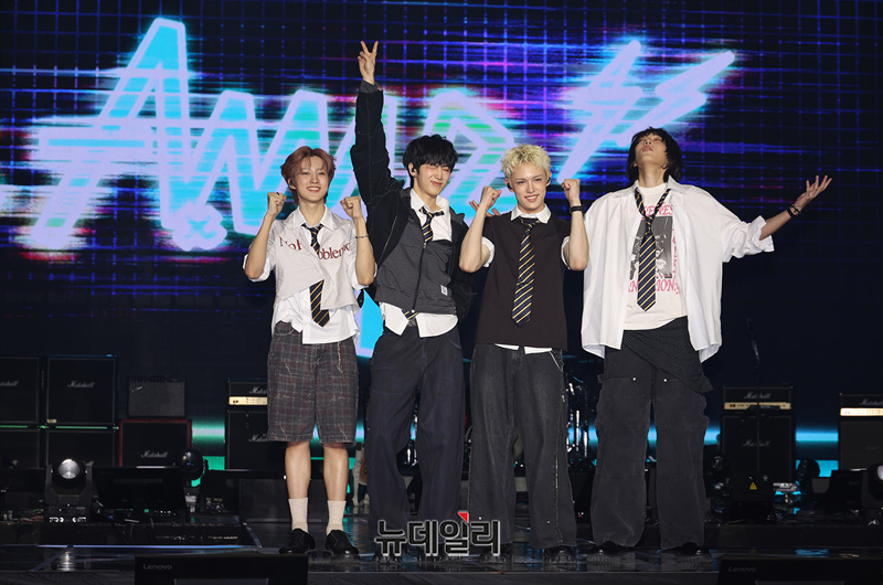 신인밴드 AxMxP(에이엠피 : 주환, 아유준, 크루, 김신)가 10일 오후 서울 송파구 올림픽공원 올림픽홀에서 열린 데뷔 앨범이자 첫 정규앨범 쇼케이스에서 포즈를 취하고 있다.