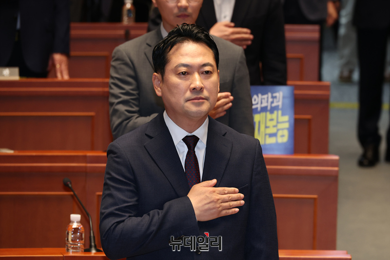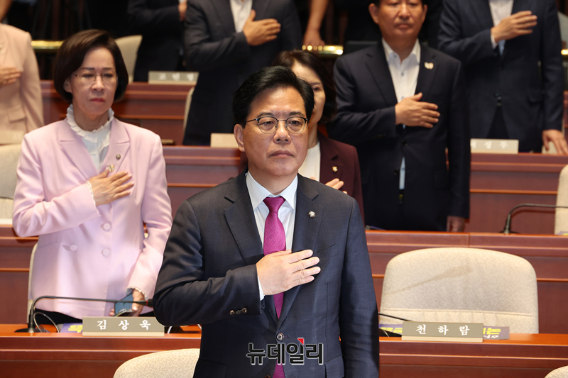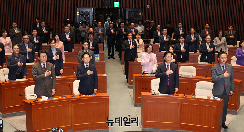 장동혁 국민의힘 대표 및 의원들이 11일 오전 국회에서 열린 의원총회에서 국민의례를 하고 있다.