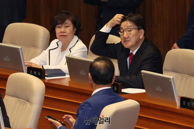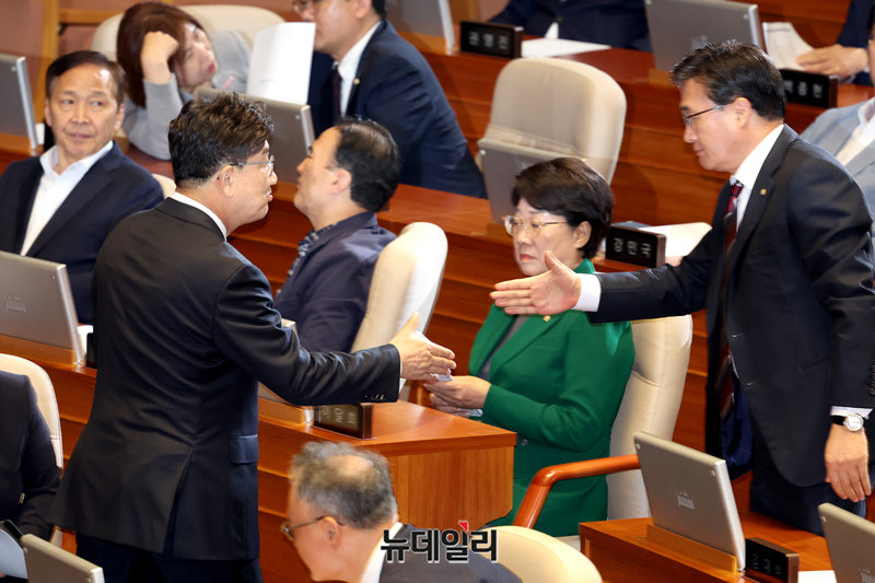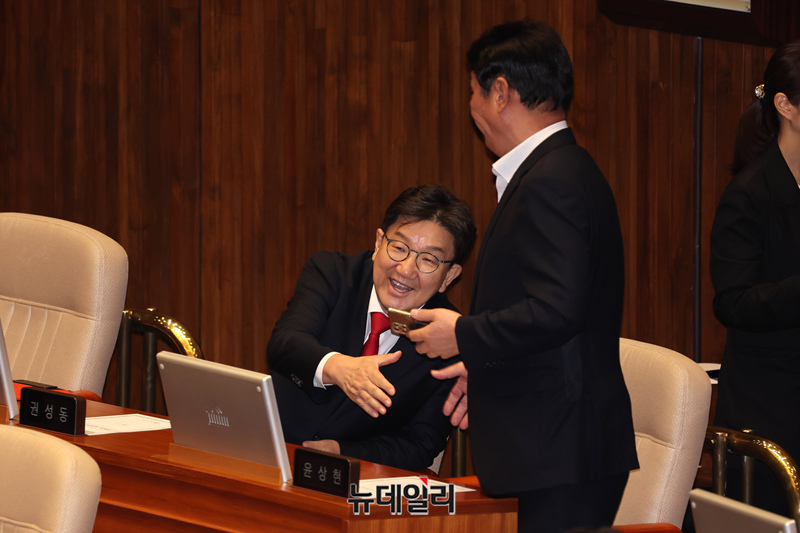 불법 정치자금 수수 혐의를 받는 권성동 국민의힘 의원이 11일 오전 국회 본회의에서 같은 당 의원들과 대화를 나누고 있다.