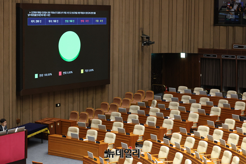 특검 수사 기간 연장·인력 증원을 하는 대신 군 검찰 지휘권, 재판 공개 의무 조항 등을 완화한 '3대 특검법(내란·김건희·채 상병) 개정안'이 11일 오후 국회 본회의에서 더불어민주당 주도로 통과되고 있다.