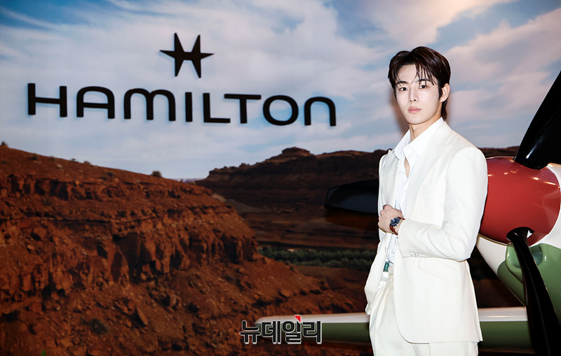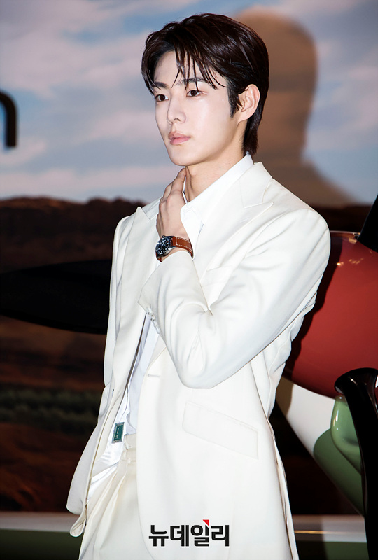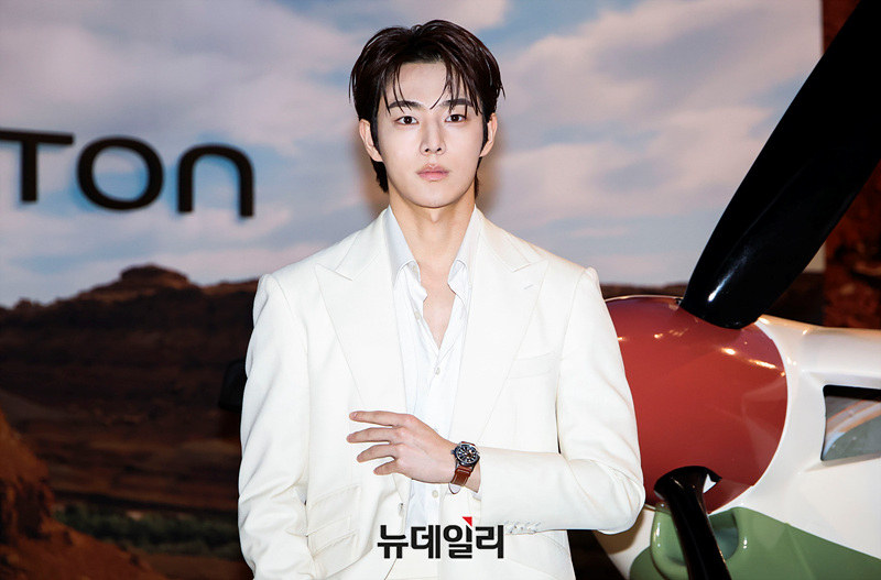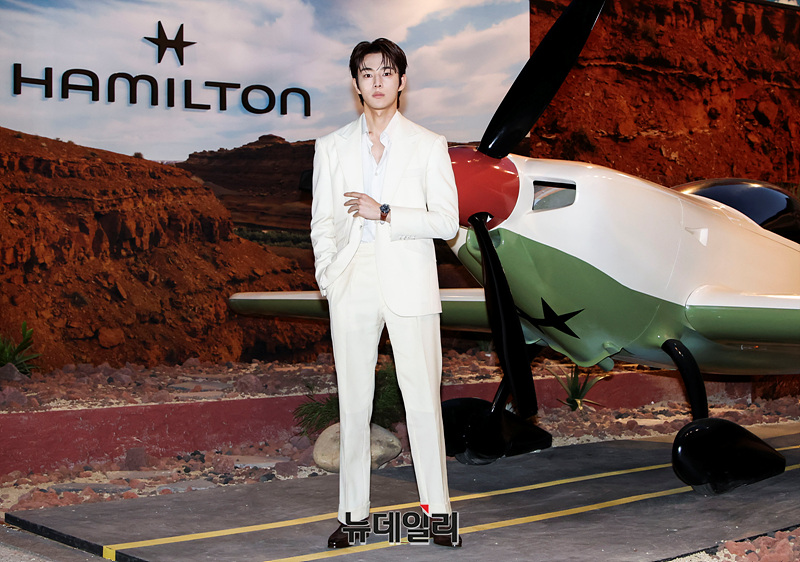 배우 유정후가 11일 오후 서울 강남구 꼴라보 하우스 도산에서 열린 워치 브랜드 해밀턴 팝업스토어 오픈 기념 포토월에서 포즈를 취하고 있다.
