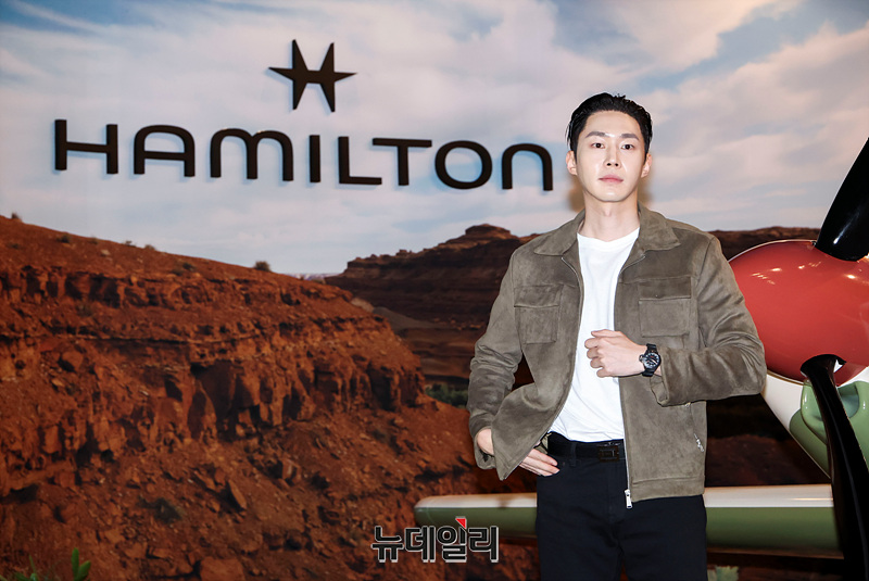 배우 무진성이 11일 오후 서울 강남구 꼴라보 하우스 도산에서 열린 워치 브랜드 해밀턴 팝업스토어 오픈 기념 포토월에서 포즈를 취하고 있다.